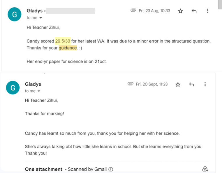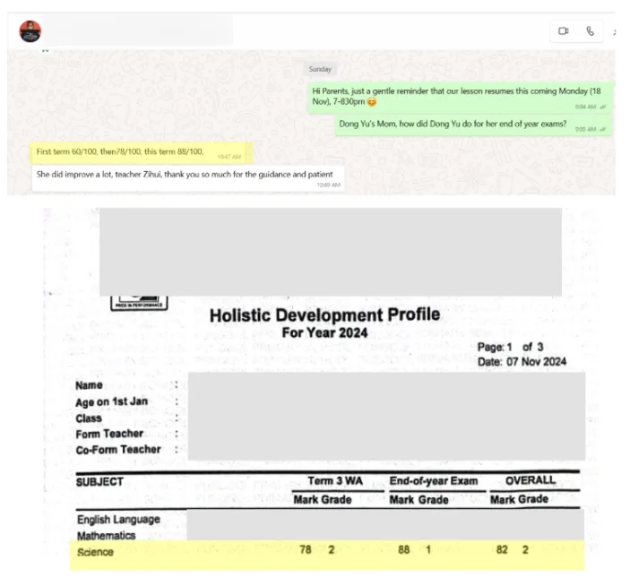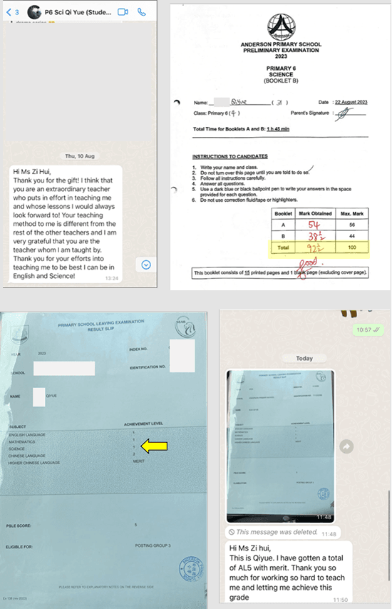“Hi Teacher Zihui, D received his prelim papers. He scored 89/100. Thank you — he enjoyed the lessons a lot and learnt so much from you. It’s a good booster for him!”
