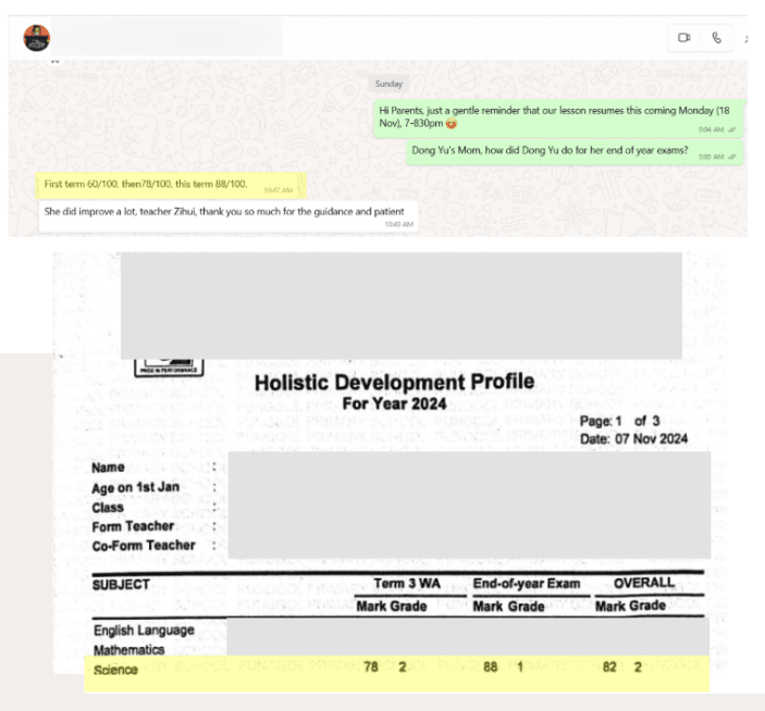 More than just grades, Caleb began to believe in himself. As he moves up Primary 6, his parents now feel encouraged that AL1 is within reach. Caleb’s story proves that with consistency, care, and active support from parents, steady progress becomes possible for every child.