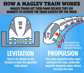 Magnets are used in Maglev trains to allow trains to float above the tracks.