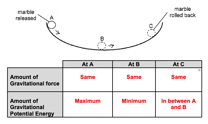 At position A (highest position): The marble possessed the greatest amount of gravitational potential energy as it was at the highest position.