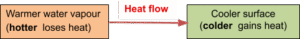 (✔) Correct: The warmer water vapour loses heat to the cooler surface and changes its state from gas to liquid.
