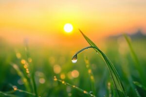 At night, the air cools and the grass blades cools. In the morning, warmer water vapour in the air came into contact with the cooler surface of the grass blades, lost heat and condensed to form water droplets on the grass, known as dew.